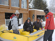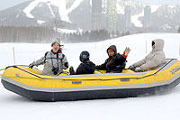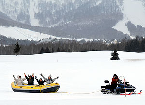 スノーモービルを楽しんだ後は、スノーラフティングを体験しよう!川下りで使うボートをスノーモービルで引っ張ってもらうという、まさに雪の上をラフティングするのだ。 大人は定員4名、子供は5〜6名は乗ることができる。 「左右にボートが滑るので、しっかり掴まって下さいね!」と、説明を受けて、イザ出発!スノーモービルが動き出すと、ボートを繋いでいるロープがグイっと突っ張りだし、ボートがゆっくりと滑りだした。 |