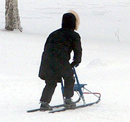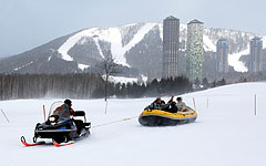 次は、スノーラフティングと同様にスノーモービルで引っ張ってくれるバナナボートを紹介しよう。 その名の通りバナナの形をしたボートだ。このバナナに跨って、取っ手にしっかり掴まろう。 スノーラフティングよりも右に左に滑り出すので、振り落とされてしまうかも。 |
