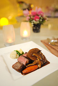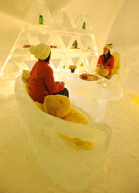 今年度からの新たな試みである、特別ディナー体験(左写真)。全8品の氷のホテルオリジナルコースが味わえるのだ。 温かいものは温かく、冷たいものは冷たく食べて頂きたいという、シェフの気持ちがこもった料理が一品ずつ運ばれてくる。また、ワインのサービスなどのため、常時ウェイターが一人付いてくれるという、高級レストランさながらのサービスである。 美味しい料理を味わいながら、氷の中にいることを忘れてしまいそうなほどの温かい贅沢な気分も味わえるという、一石二鳥のコースとなっている。 ここでしか味わえない料理の数々。 そして、完全貸切状態のプライベートな空間。 この雰囲気は是非とも、ご自分で体験して頂きたい。 |