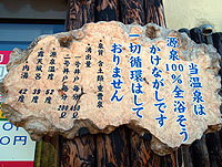 早速車を駐車場に停め、玄関へ向かうと「源泉100%全浴槽かけ流し、循環無し」と、書かれた看板が掲げられていた。 |